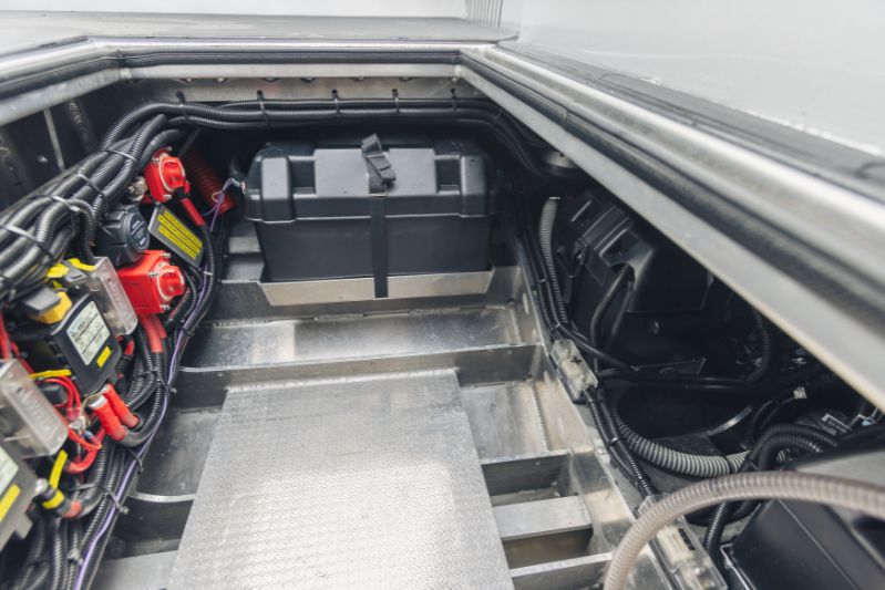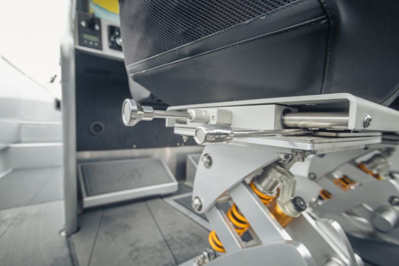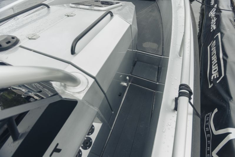 Det framgår tydligt av allt, att Anytec är byggd för tuff körning. Dess heltäckande aluminiumstruktur är exceptionellt styv och det V-formade skrovet med variabel vinkel är djupt: 23 grader akter och 48 grader i fören. Räcken, pollarna och T-topptaket är alla svetsade. Skrovet är en traditionell motorbåtsdesign, d.v.s. kraftiga steglister, men utan steg.